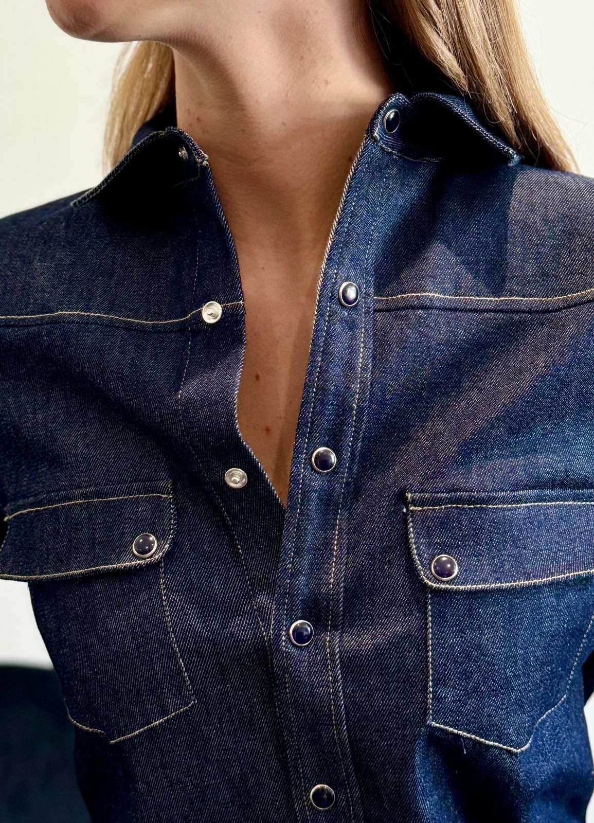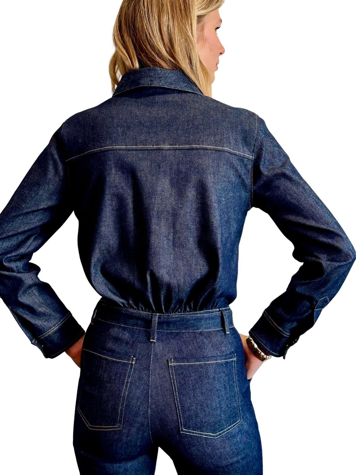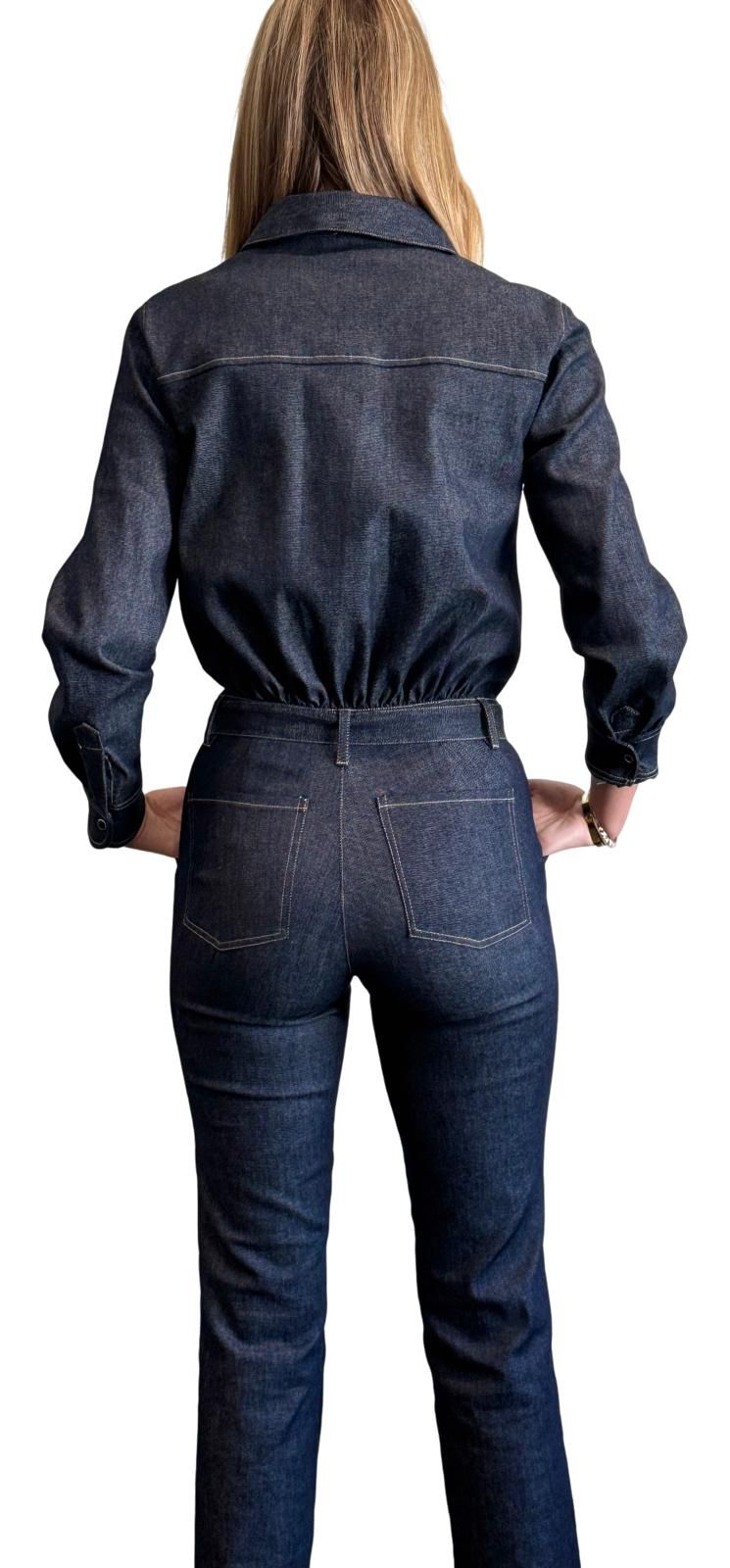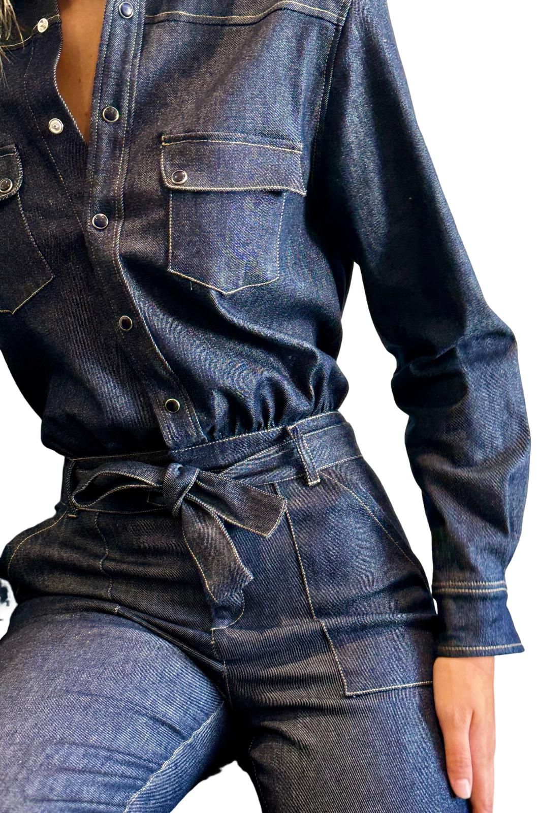 - Design : Haut blousant esprit chemise en jean, taille marquée, et jambe évasée