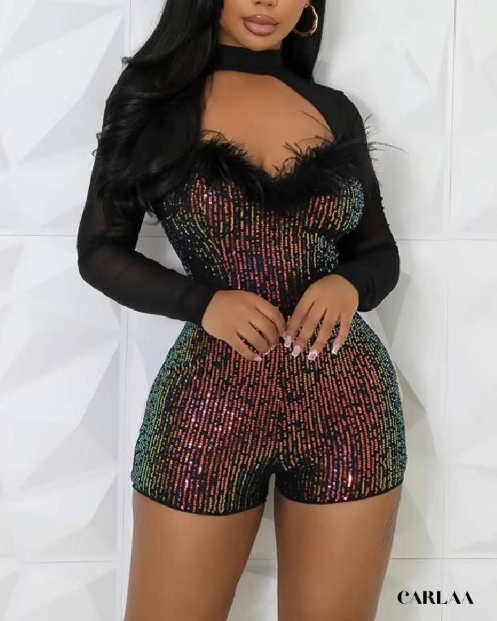 Découvrez le combi short de soirée qui fera de vous la star de toutes vos événements. Cette pièce intemporelle évoque le glamour et la sophistication, vous permettant d’affirmer votre style avec confiance. Son tissu à sequins multicolores illuminera votre silhouette, attirant tous les regards et créant un impact visuel inoubliable lors de vos soirées.