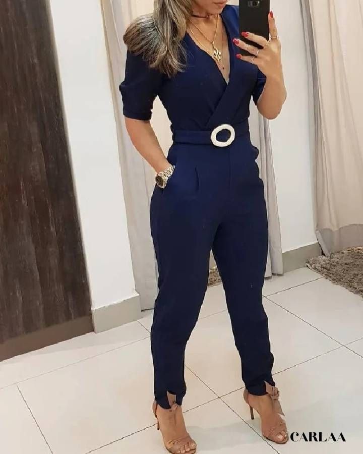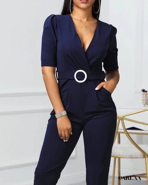 Cette combinaison, d’un bleu intense et majestueux, est la quintessence du chic. Avec des manches d’une longueur intermédiaire et un pantalon qui s’étend élégamment, elle dessine une silhouette raffinée et allongée. Son décolleté en V attire subtilement le regard, mettant en valeur ta poitrine avec finesse.
