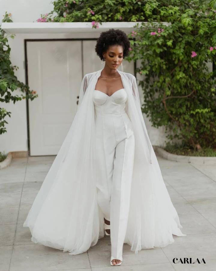 Cette combinaison a été conçue pour vous permettre de vous sentir à l’aise tout en étant magnifique, vous garantissant ainsi des moments de bonheur inoubliables. Sa coupe audacieuse vous offre une totale liberté de mouvement, vous permettant de profiter pleinement de chaque instant, qu’il s’agisse des cérémonies ou des réceptions. Grâce à cette pièce unique, vous serez la définition même de l’originalité lors de votre mariage.