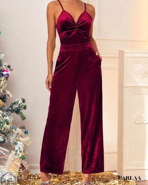 Cette pièce exquise, confectionnée dans un velours riche et somptueux, est ta carte maîtresse pour une élégance sans effort. Son haut ajusté met en valeur la poitrine avec un design torsadé et des bretelles fines qui ajoutent une touche de délicatesse. La taille haute se fond dans des pantalons à coupe droite, créant une silhouette nette et raffinée.