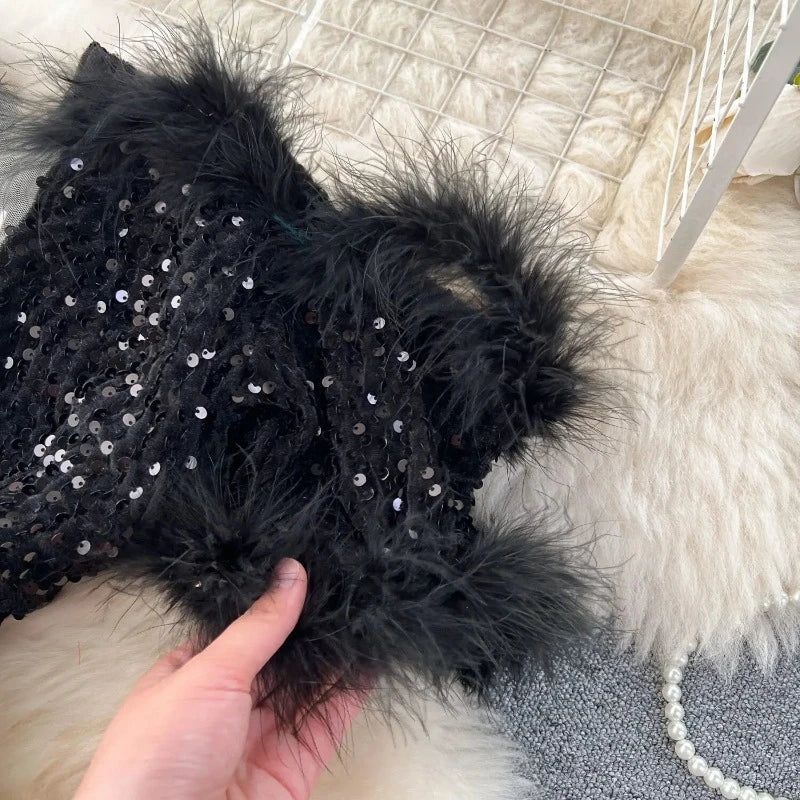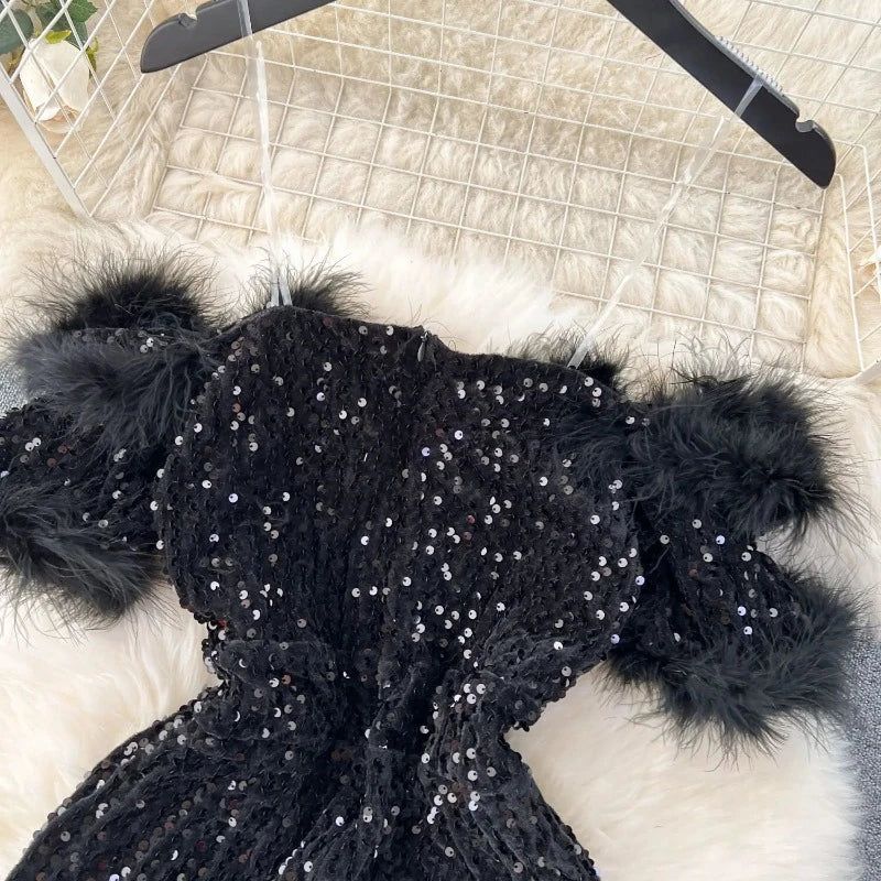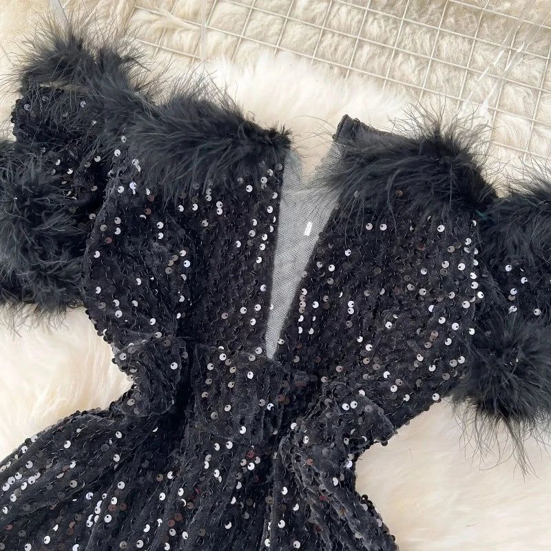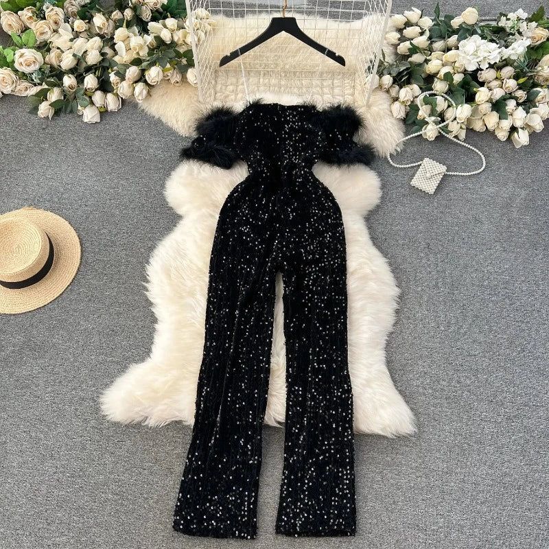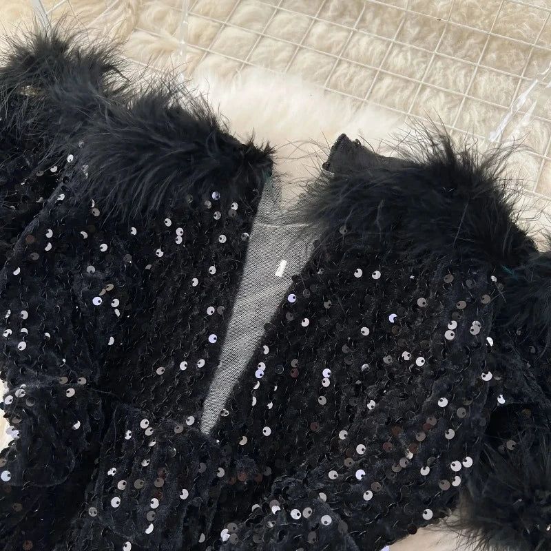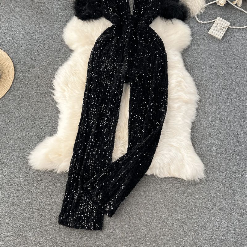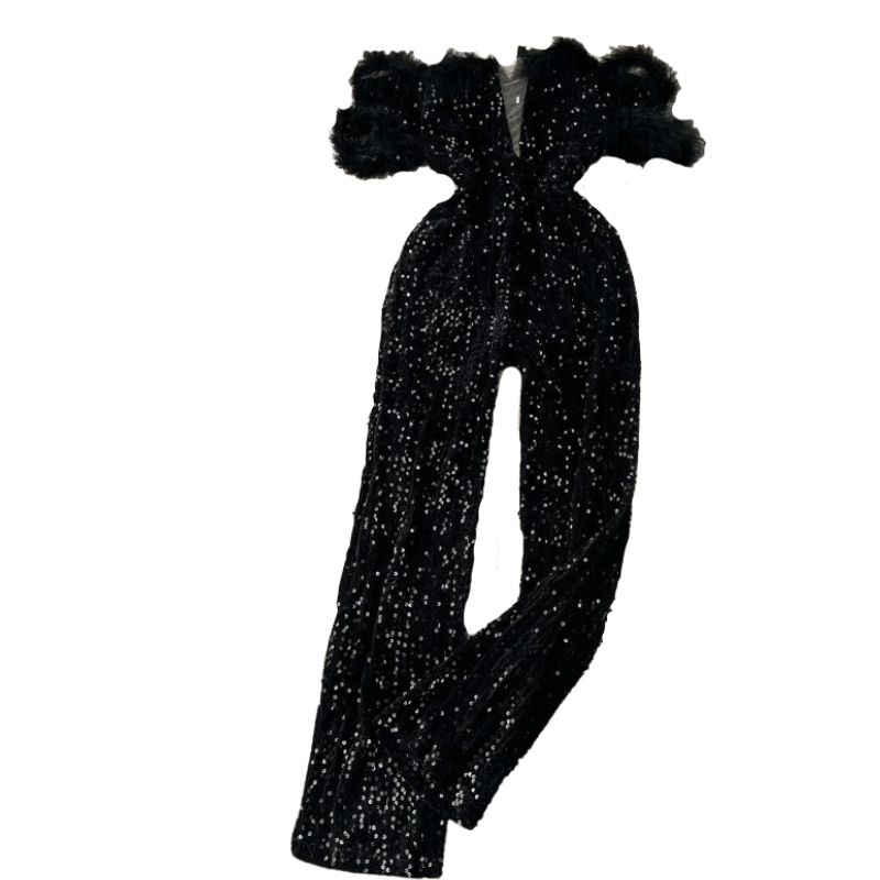 Imaginez-vous sur la piste de danse, recevant de nombreux compliments tout en affichant votre confiance en soi. La combinaison paillette noire est votre meilleur atout pour rehausser votre allure et vous sentir glamour à chaque instant. Ses détails, tels que le décolleté en V et les plumes, ajoutent une touche de luxe qui saura vous ravir.