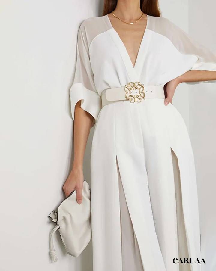 Imaginez-vous dans cette combinaison pantalon blanche, participant à un gala somptueux ou à un dîner élégant. Chaque pas que vous ferez sera une déclaration de style, attirant les regards admiratifs tout autour de vous. L’attrait de ce vêtement réside dans sa capacité à faire de vous le centre de l’attention.