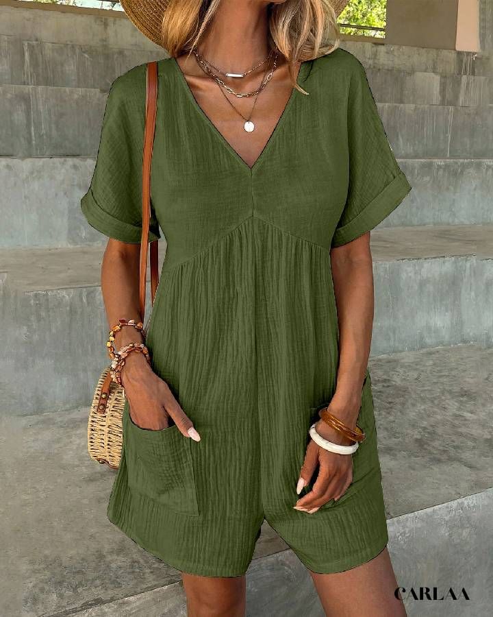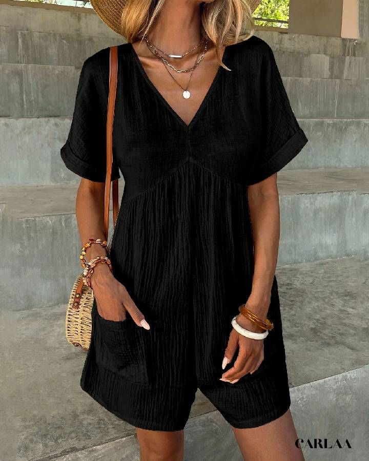 La combishort s’adapte à tous vos événements, que ce soit un brunch entre amis ou des fêtes de fin de semaine. Son décolleté en V et ses manches courtes ajoutent une touche chic et féminine, tout en garantissant un style agréable à porter tout au long de la journée.